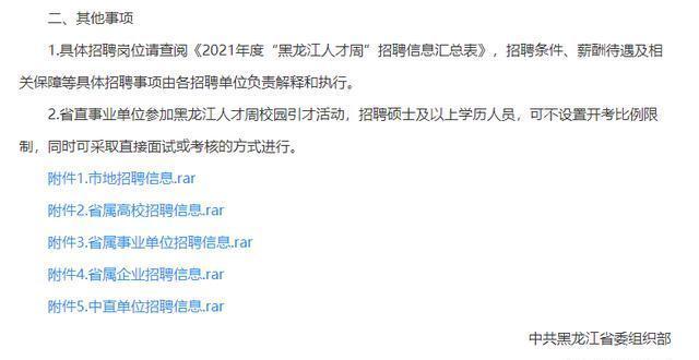 2.市(地)企事业单位:哈尔滨市、齐齐哈尔市、牡丹江市、佳木斯市、大庆市、鸡西市、双鸭山市、伊春市、七台河市、鹤岗市、黑河市、绥化市、大兴安岭地区的事业单位346个、岗位926个,计划招聘1765人;国有企业15个、岗位88个,计划招聘158人;民营企业94个、岗位339个,计划招聘1367人。